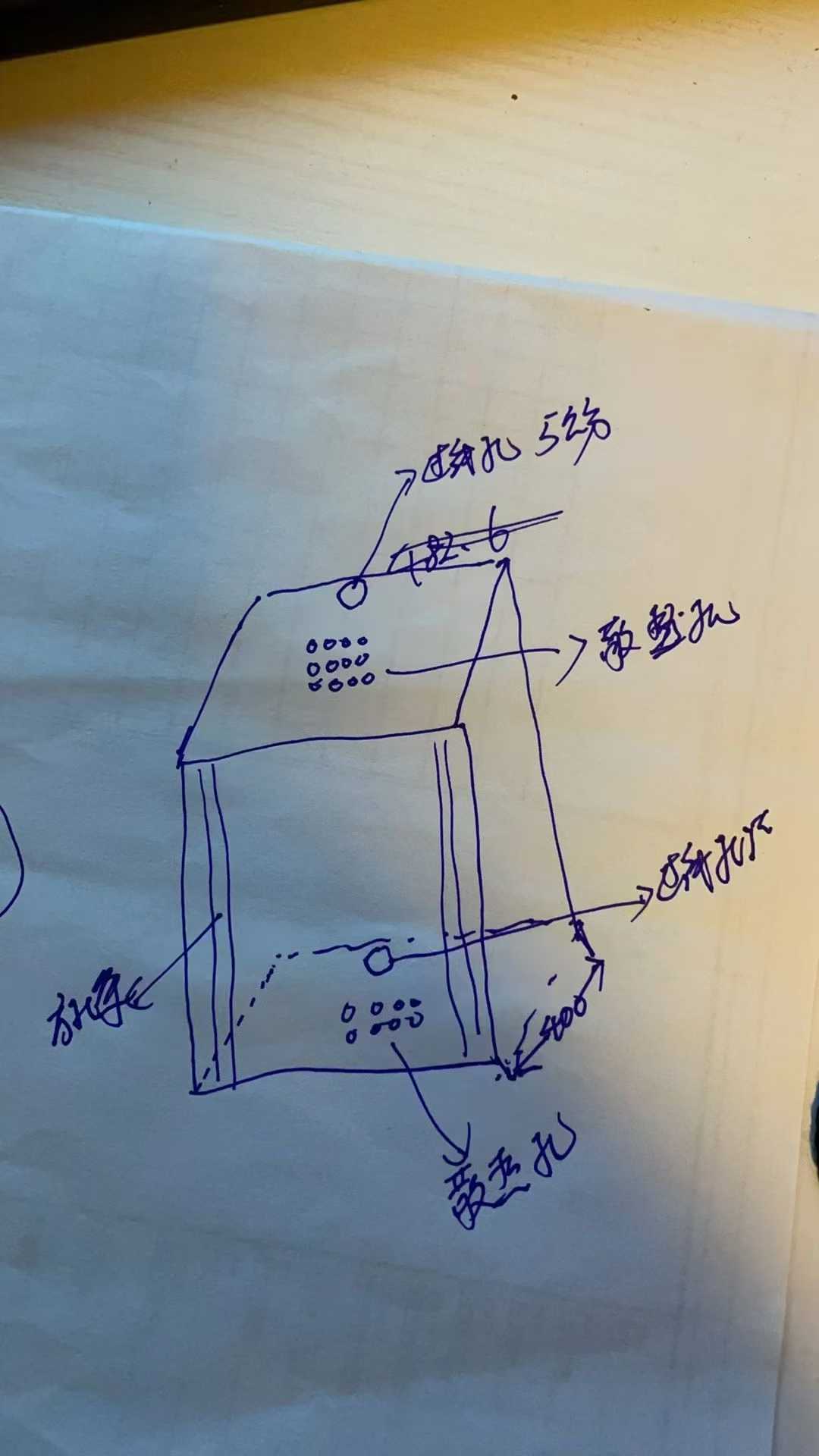 這是一張客戶手繪的草圖,并提出幾個明確的需求:“我們的設(shè)備沒這么大,弱電箱箱體深度做400mm足夠,要上墻連接橋架安裝,需要預(yù)留50mm過線孔,并且上下蓋板需留散熱孔?!?/span>